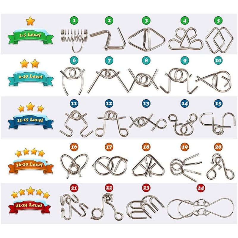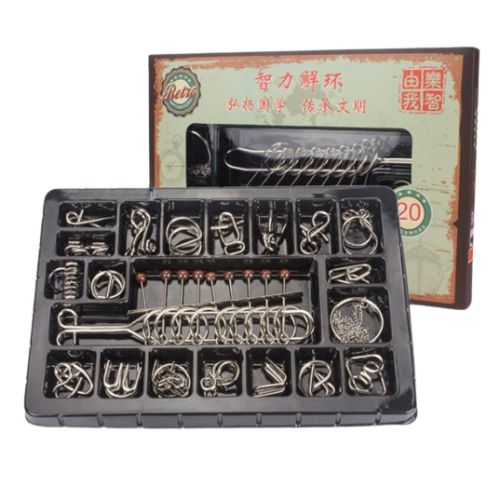 Im Gegensatz zu Holzpuzzles, die sich durch Formen zusammensetzen, bieten Metallpuzzles Herausforderungen mit vielfältigeren Mechanismen. Sie sind manchmal von traditionellen chinesischen Puzzles inspiriert, wie den berühmten chinesischen Ringpuzzles. Diese Lernspielzeuge stärken die Fähigkeiten zur Deduktion und Feinmotorik. Sie sind auch ausgezeichnete Geschicklichkeitsspiele, vergleichbar mit Strategiespielen oder Geduldsspielen wie dem Holzsolitär oder dem bekannten Dame-Spiel.